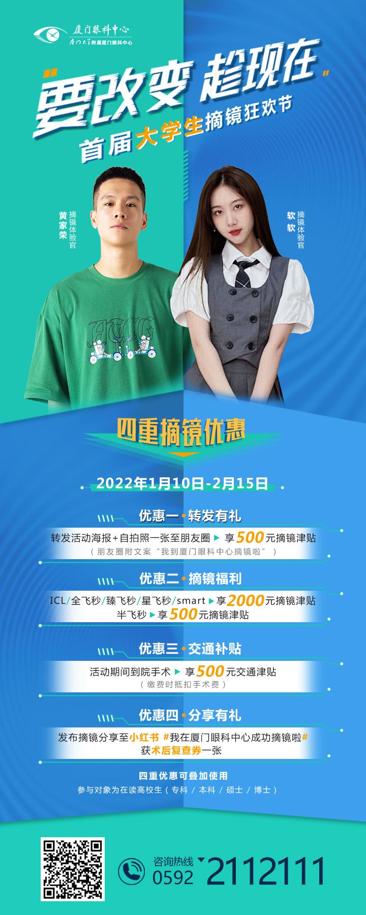守護光明,溫暖助力【文章導(dǎo)讀】2022年1月10日-2月15日 廈門眼科中心 大學(xué)生摘鏡狂歡節(jié) 席卷卷卷卷而來 四重摘鏡福利 丟掉眼鏡 丟掉煩惱 要改變 趁!現(xiàn)!在! 讓我們一起做 新時代有才有為有顏值的高知分子吧 活動時間: