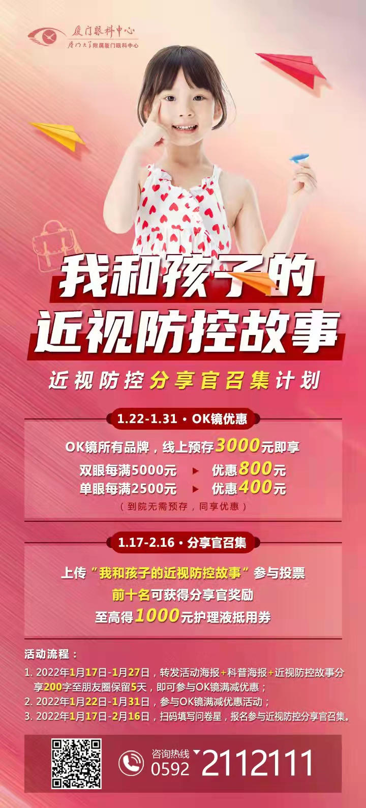 轉(zhuǎn)發(fā)活動(dòng)海報(bào)+科普海報(bào),并分享近視防控故事(不少于200字)至朋友圈保留5天,即可解鎖福利二優(yōu)惠。(開頭需帶話題#我和孩子的近視防控故事)活動(dòng)時(shí)間:2022年1月17日-1月27日