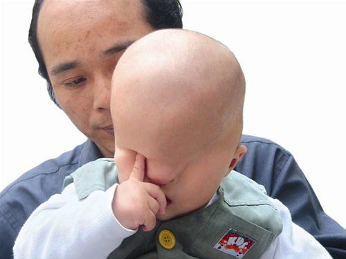 剛滿1周歲的小旭生下來就沒有眼睛,一張臉很令人吃驚——眼部凹陷,像是兩個(gè)眼窩,眼部只有完整而光滑的皮膚,沒有眉毛,也沒有睫毛,鼻子像一個(gè)小蘿卜頭似的,杵在臉盤中央。