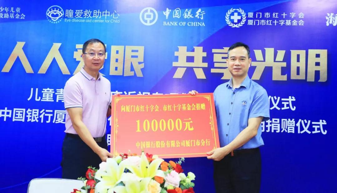 活動(dòng)當(dāng)天,還舉辦了中國(guó)銀行股份有限公司廈門市分行、廈門市紅十字會(huì)光明捐贈(zèng)儀式。中國(guó)銀行廈門分行積極擔(dān)當(dāng)社會(huì)責(zé)任、履行社會(huì)義務(wù),在愛眼日來(lái)臨之際,向廈門市紅十字基金會(huì)捐贈(zèng)10萬(wàn)元,用于困難眼疾患者的救助。