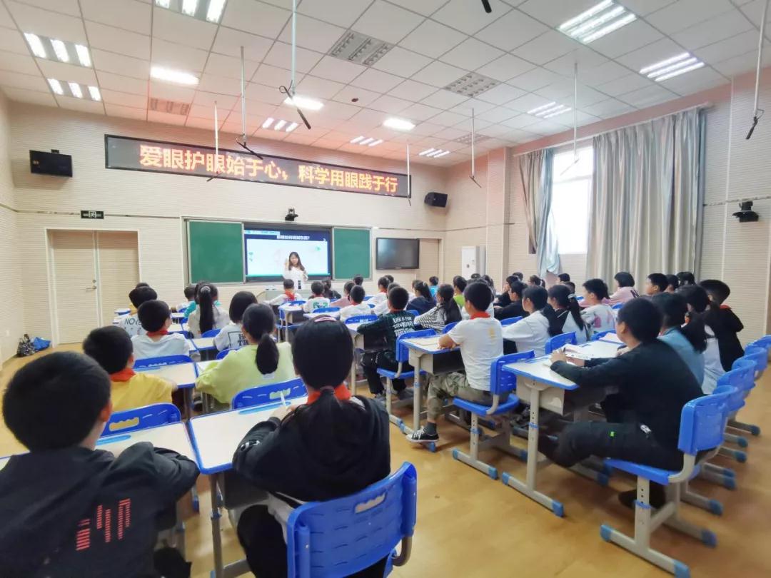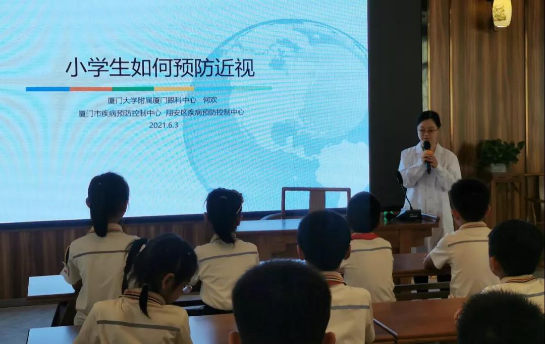 ▲廈門眼科中心斜視與小兒眼科副主任醫(yī)師何歡為小學(xué)生進(jìn)行近視防控科普