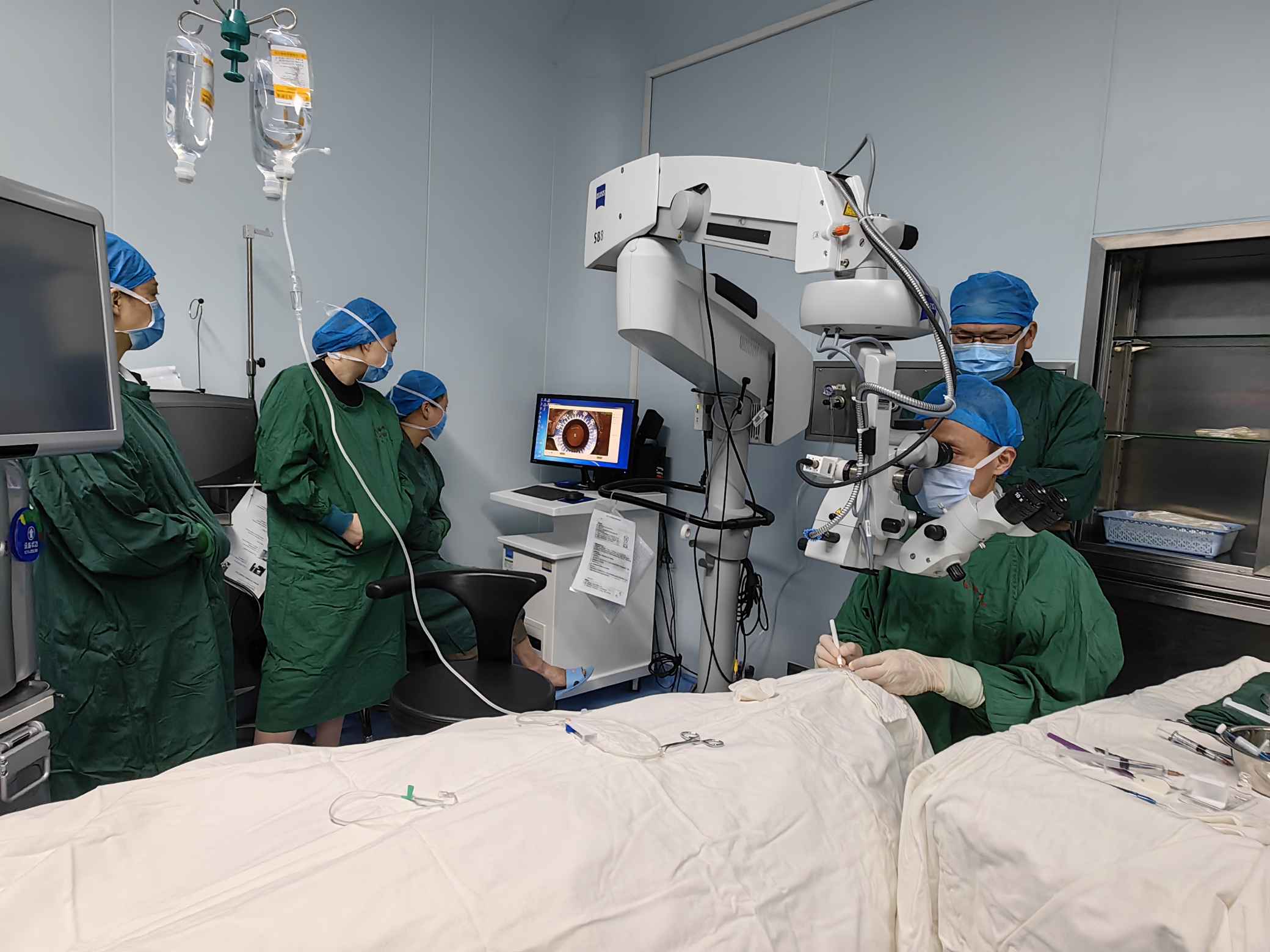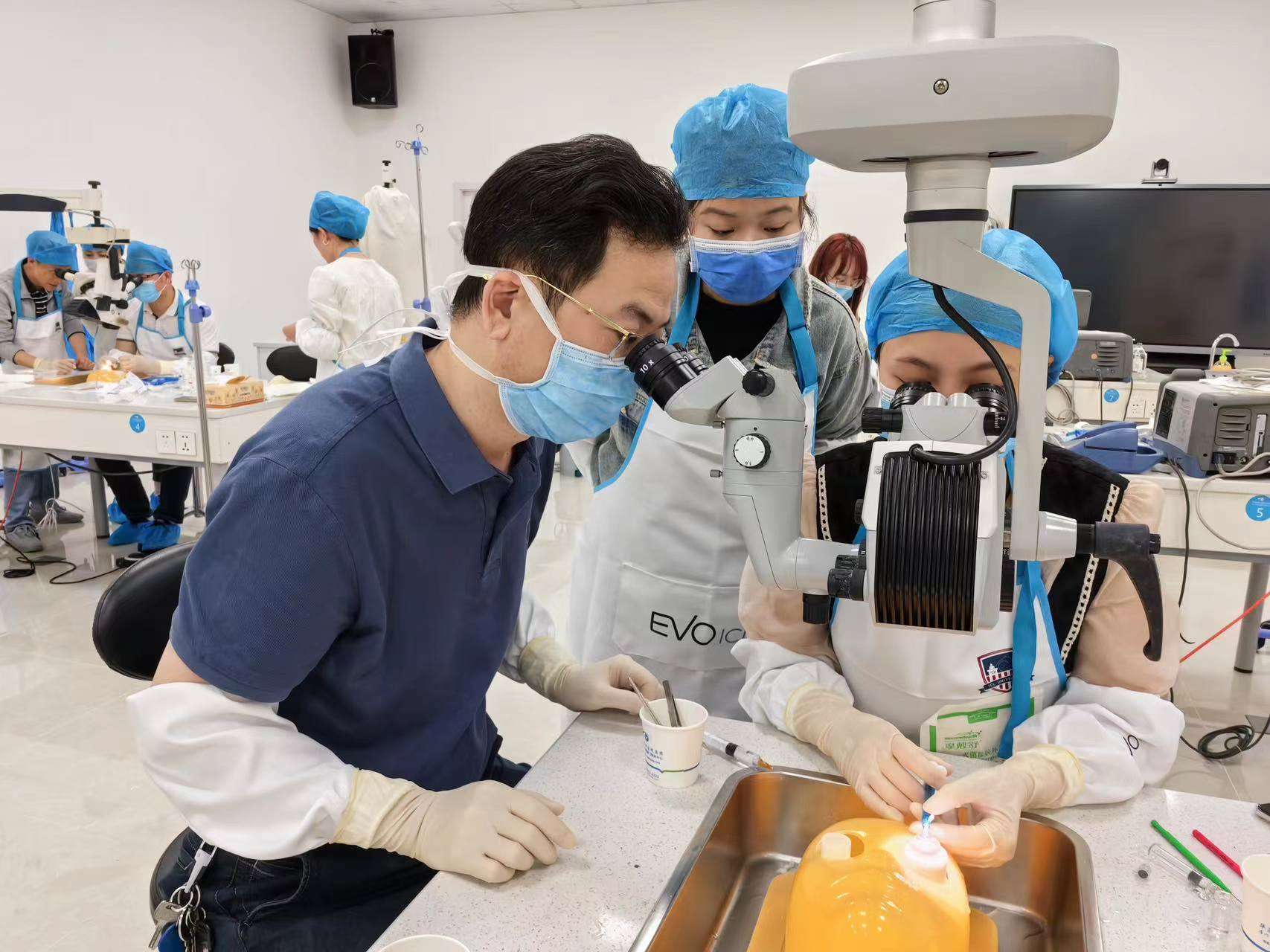 手術(shù)觀摩環(huán)節(jié),劉才遠(yuǎn)教授、鄭林主任對學(xué)員們進(jìn)行一對一手術(shù)技巧的帶教操作指導(dǎo)。他們不僅是國內(nèi)為數(shù)不多ICL手術(shù)經(jīng)驗(yàn)豐富的專家,還是各地ICL手術(shù)醫(yī)生的帶教、培養(yǎng)及考核導(dǎo)師。