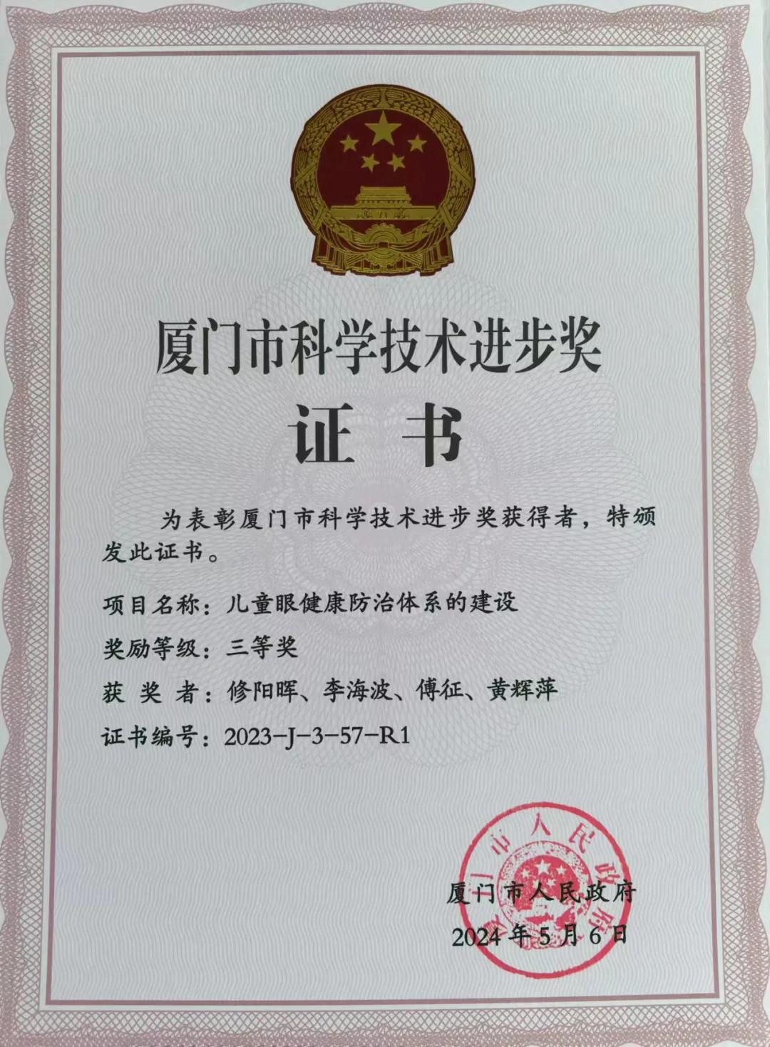 《廈門市科學技術進步獎》證書