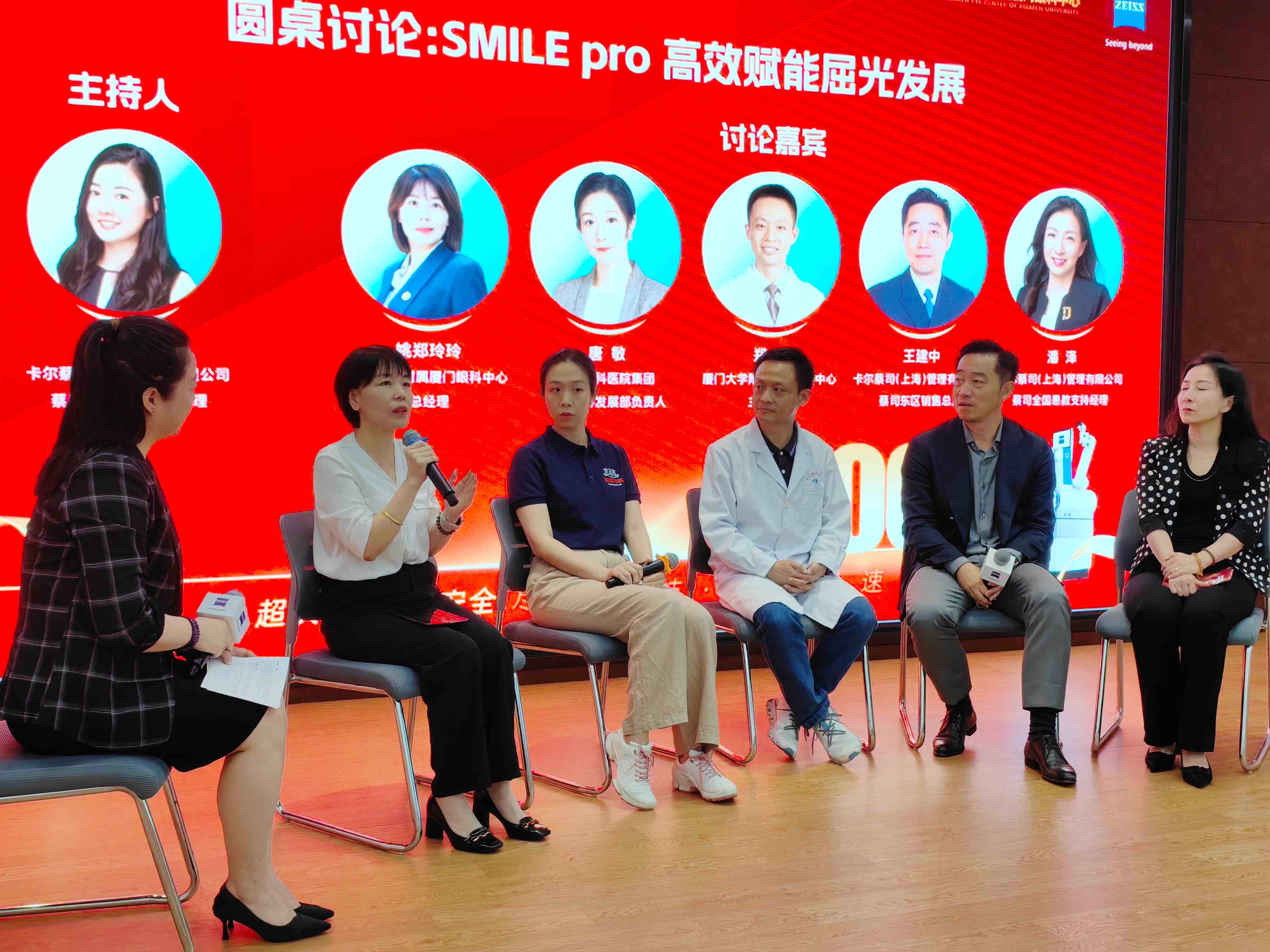 廈門眼科中心總經(jīng)理姚鄭玲玲、華廈眼科醫(yī)院集團屈光學(xué)科發(fā)展部負責(zé)人唐敏、廈門眼科中心屈光科主任醫(yī)師鄭林、蔡司眼科大東區(qū)銷售總監(jiān)王建中、蔡司醫(yī)療屈光全國患教經(jīng)理潘澤等嘉賓,圍繞SMILE Pro技術(shù)在屈光領(lǐng)域的應(yīng)用現(xiàn)狀、未來發(fā)展、提升手術(shù)質(zhì)量與患者體驗等議題展開深度探討:
