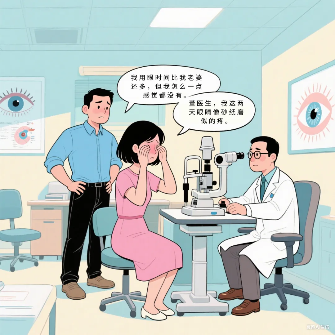 剛結(jié)束加班的設(shè)計師麗麗不停揉著發(fā)紅的眼睛:"董醫(yī)生,我這兩天眼睛像砂紙磨似的疼。"而陪她來的程序員丈夫阿強插話:"我用眼時間比我老婆還多,但我怎么一點感覺都沒有。"